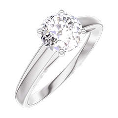 De ring weegt ongeveer 2,9 gram in 18 karaat witgoud met een diamant van 0,7 karaat.