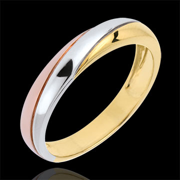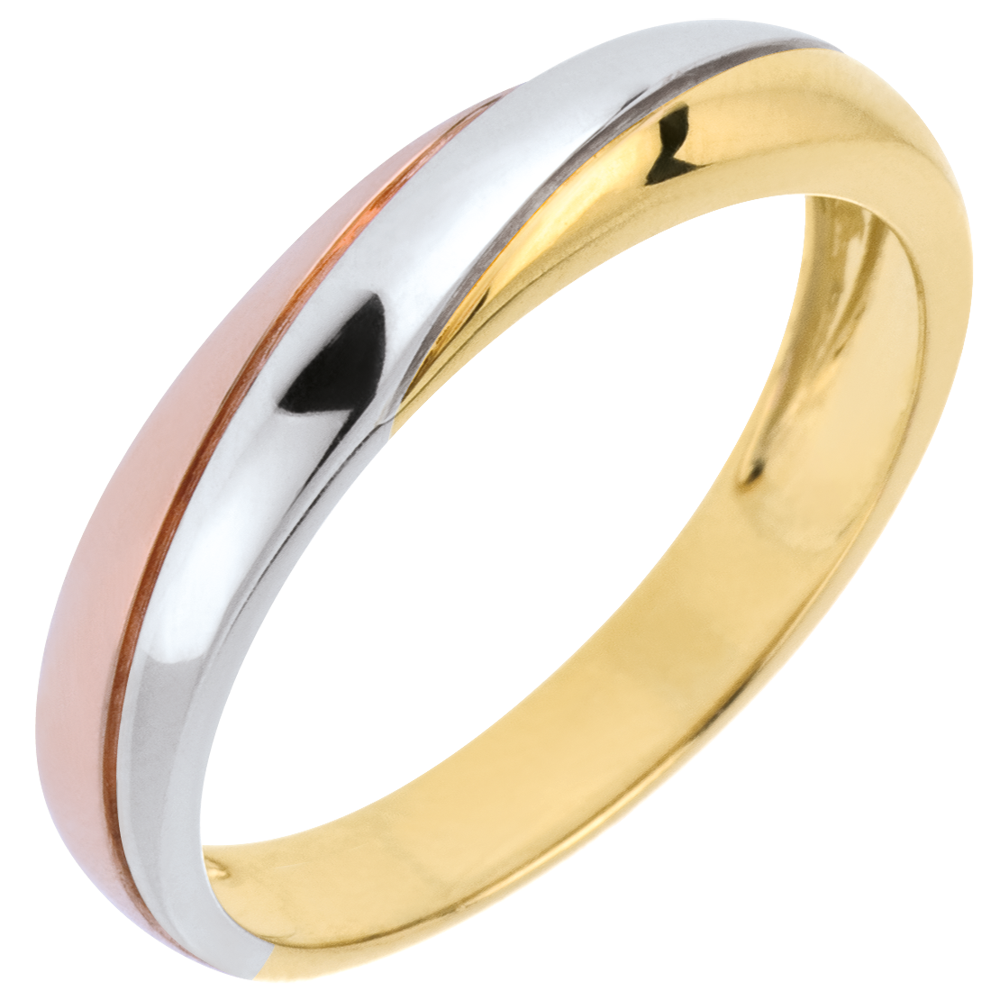 Schoonheid en elegantie voor een trouwring van drie eeuwige goudsoorten.