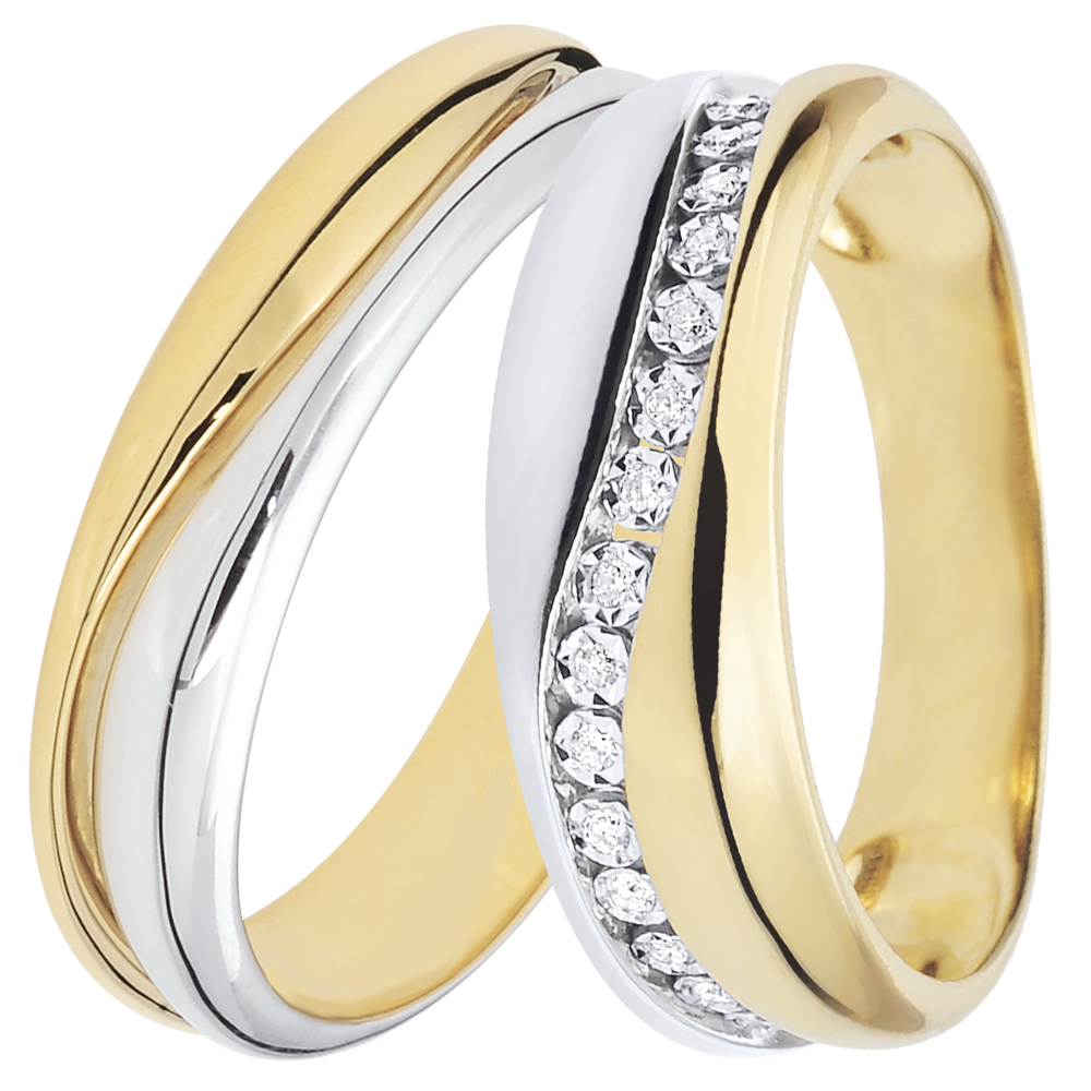 Deze ring combineert smaakvol geelgoud en witgoud en wordt doorkruist door een vloeiende curve waarop zich 15 diamanten bevinden.