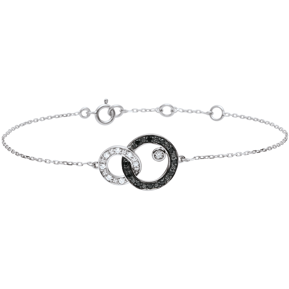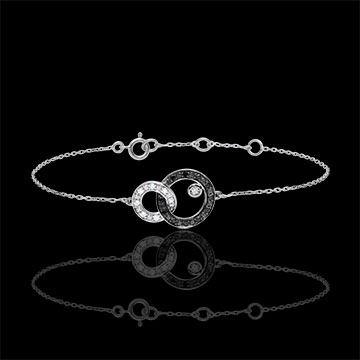 Zoals linten, zijn gouden cirkels verstrikt in flexibiliteit. Een cirkel in witgoud en zwarte diamanten draagt een solitairee diamant op een gouden plaat.