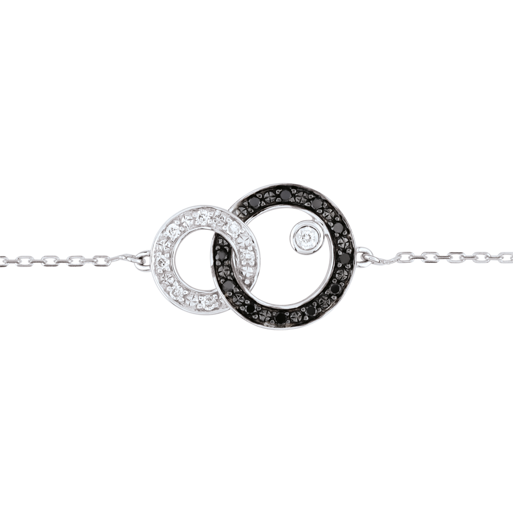 Zoals linten, zijn gouden cirkels verstrikt in flexibiliteit. Een cirkel in witgoud en zwarte diamanten draagt een solitairee diamant op een gouden plaat.