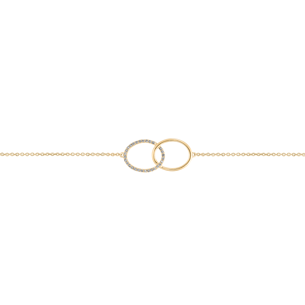 Als linten zijn de geelgouden cirkels licht verstrengeld. Een geheel gouden cirkel en een cirkel van goud en diamant.