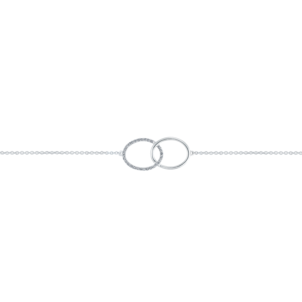 Als linten zijn de witgouden cirkels licht verstrengeld. Een geheel gouden cirkel en een cirkel van goud en diamant.