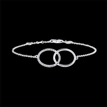 Als linten zijn de witgouden cirkels licht verstrengeld. Een geheel gouden cirkel en een cirkel van goud en diamant.