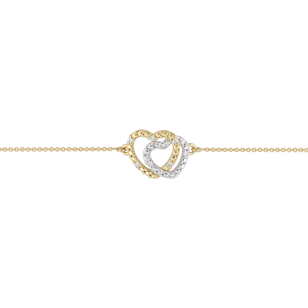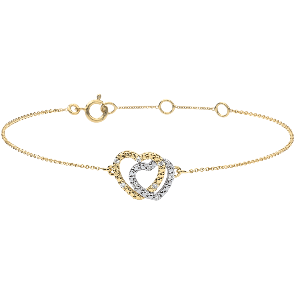 De harten worden versterkt door de stralende schittering van 9 fonkelende diamanten, die een verfijnde toets aan deze armband toevoegen.