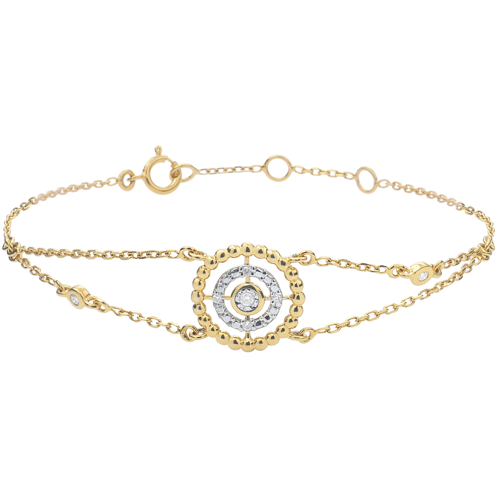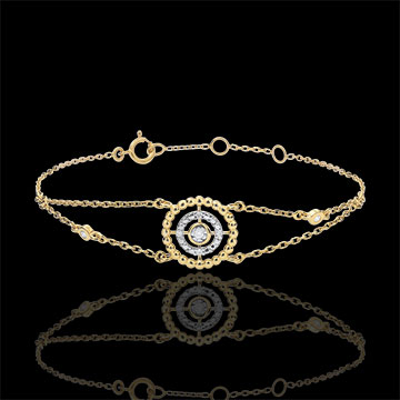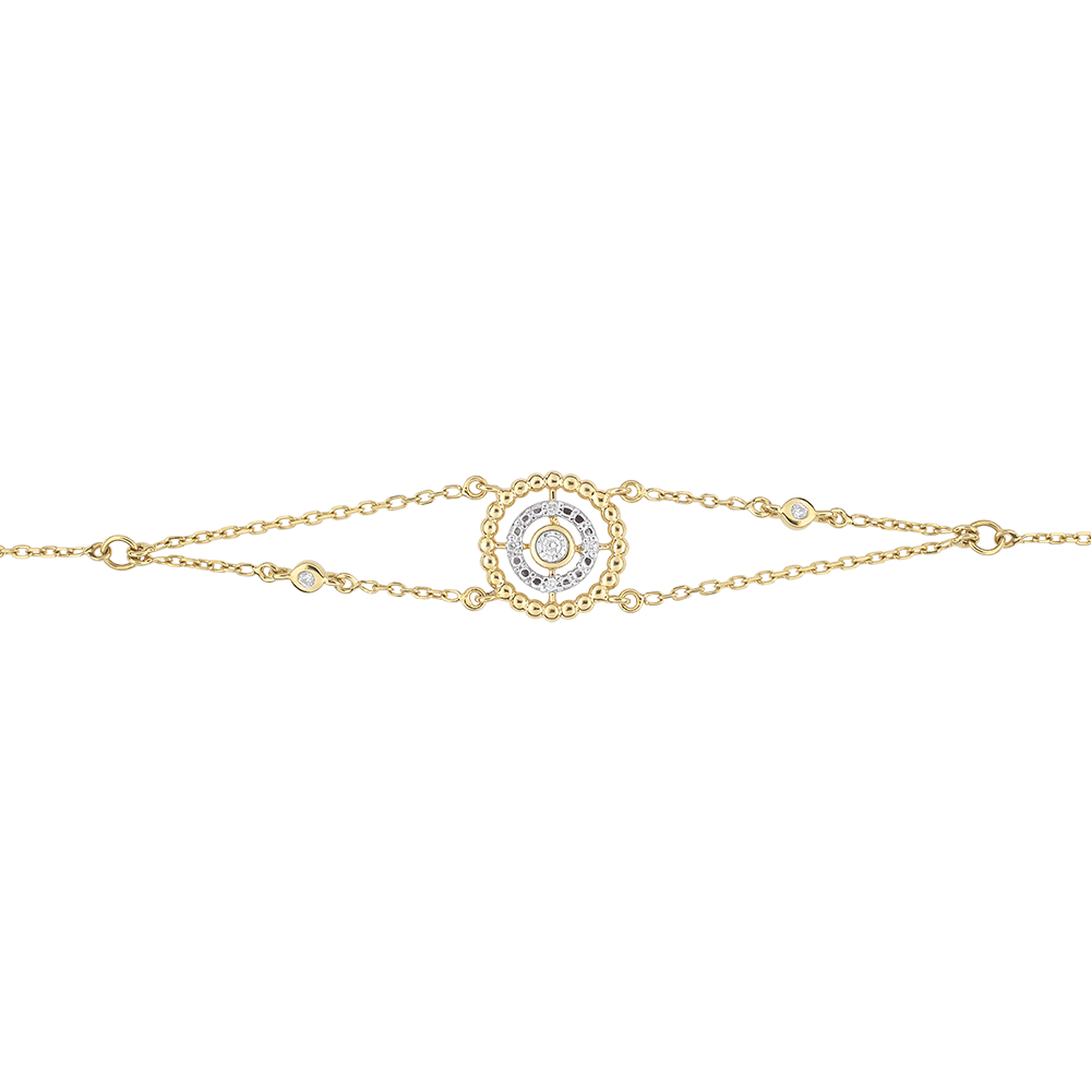 Een cirkel van gouden parels rond een cirkel van diamanten en een solitaire in het centrum.Dit juweel is gezet aan een ketting bezet met twee diamanten. Armband met verstelbare lengte: 18cm, 17cm, 16cm.