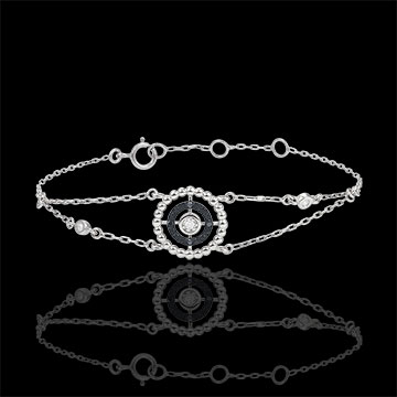 Een cirkel van gouden parels rond een cirkel van diamanten en een solitaire in het centrum. Armband met verstelbare lengte: 18cm, 17cm, 16cm.