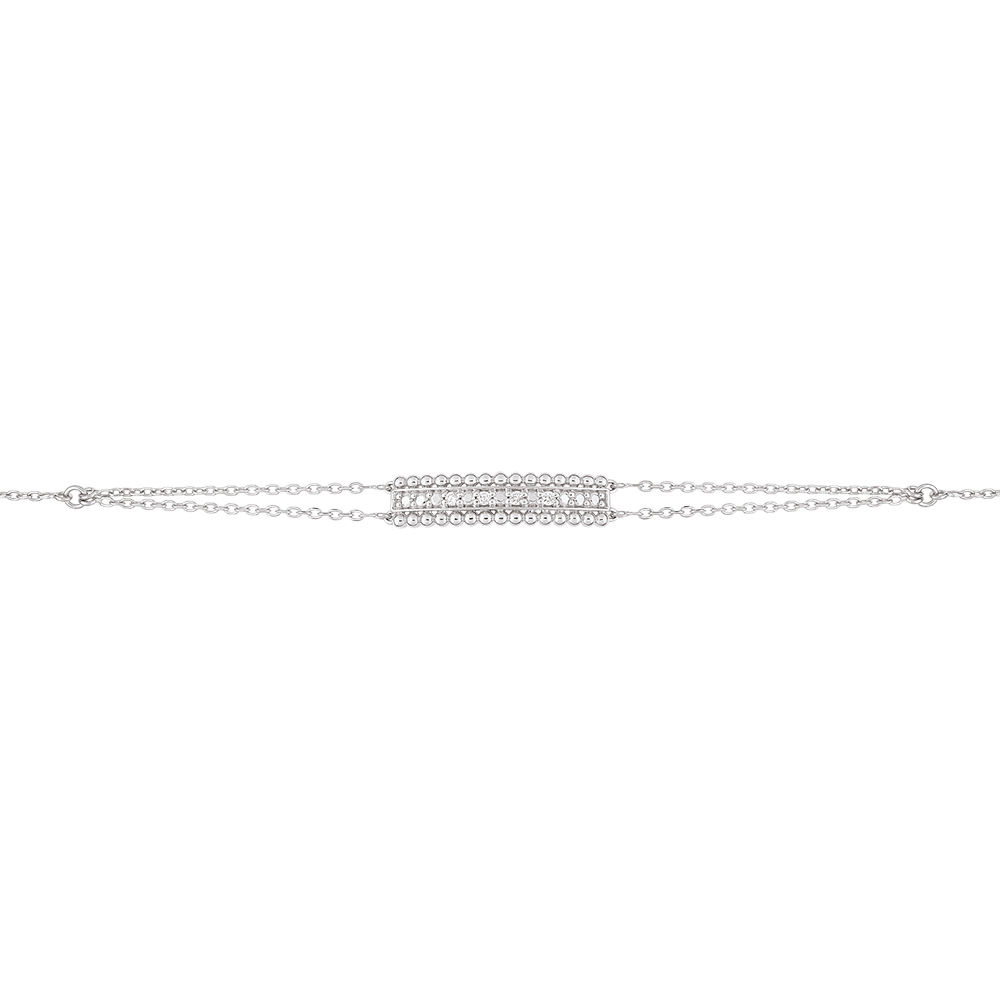 Twee rijen van gouden parels op een frame van witgoud en een diamanten pavézetting. Het patroon is helemaal af door twee kleine ketens die samenkomen. Armband met verstelbare lengte: 18cm, 17cm, 16cm. Motief 21mm lengte en 5mm hoogte.