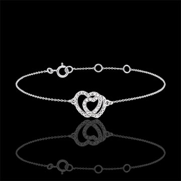 Dit prachtige sieraad, versierd met twee in elkaar verstrengelde harten van fijn bewerkt witgoud, symboliseert tederheid en verbondenheid.