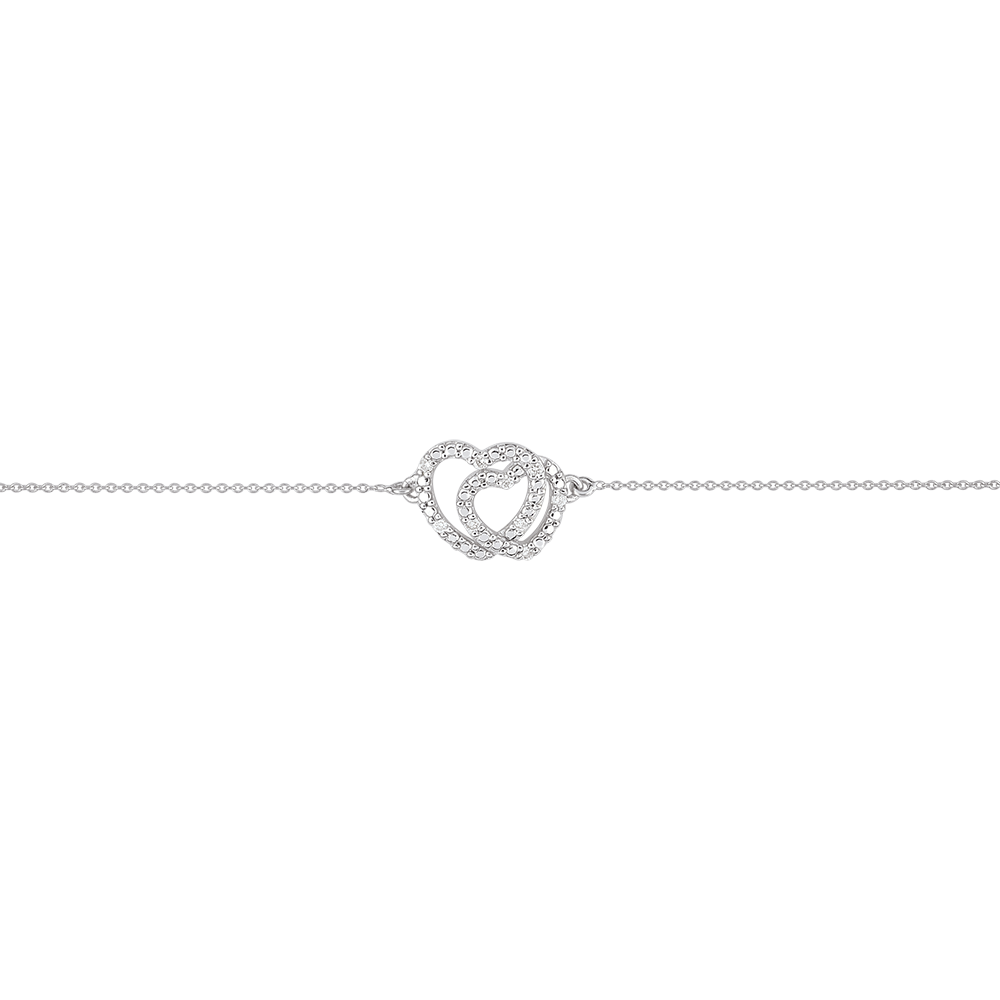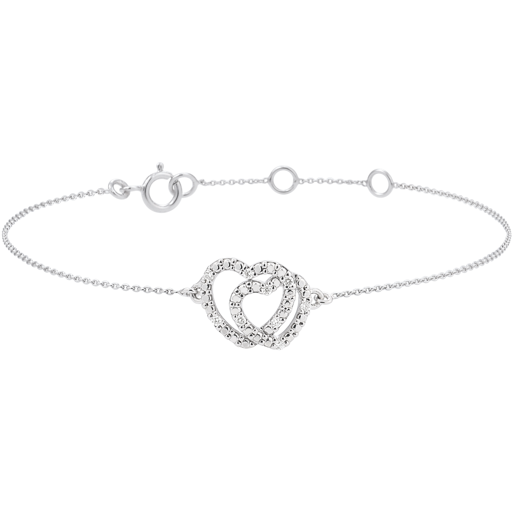 De harten worden versterkt door de stralende schittering van 9 fonkelende diamanten, die een verfijnde toets aan deze armband toevoegen.