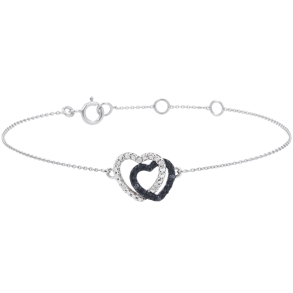 De harten worden versterkt door de stralende schittering van 5 fonkelende diamanten en 4 zwarte diamanten, die een verfijnde toets aan deze armband toevoegen.