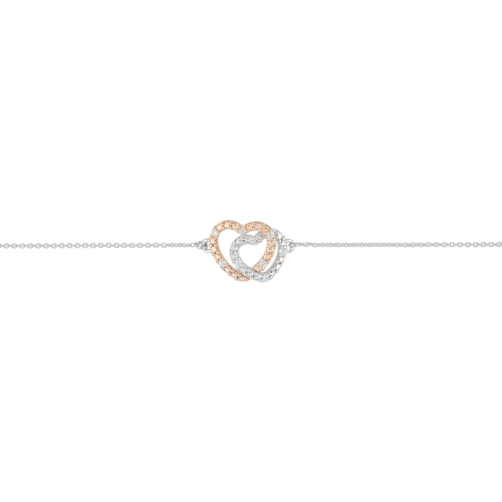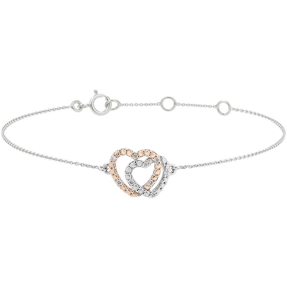 De harten worden versterkt door de stralende schittering van 9 fonkelende diamanten, die een verfijnde toets aan deze armband toevoegen.