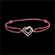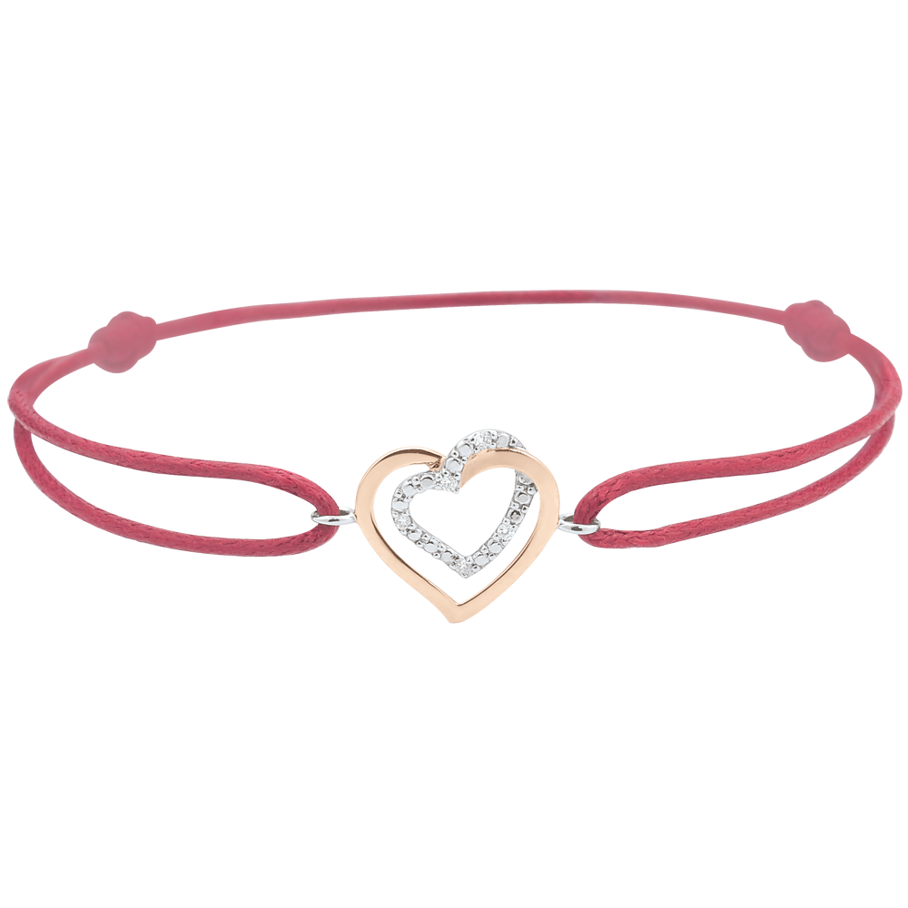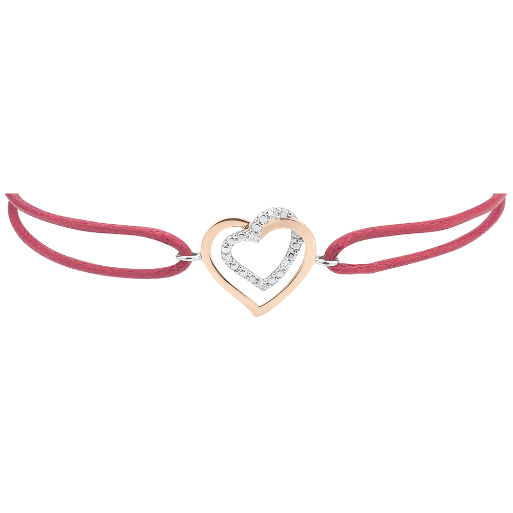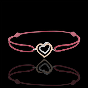 Een duo van harten in tedere en romantische krullen, in delicaat roségoud en witgoud, bezet met diamanten. Het motief is aangebracht op een modern rood koord.