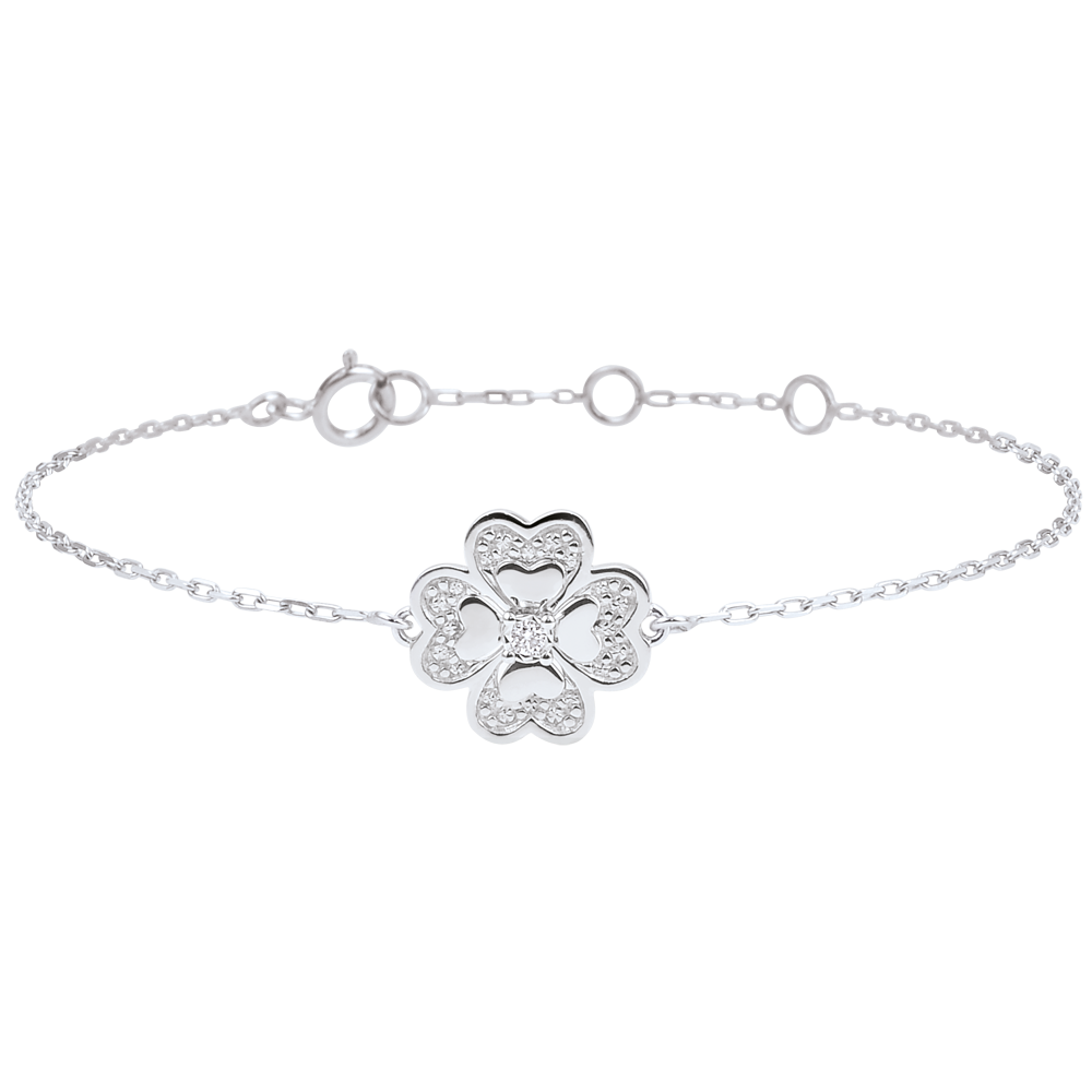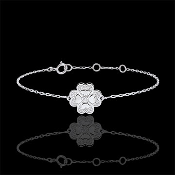 Een moderne armband, 4 bladen met centrale fonkelende diamant, gepolijst witgoud en gouden bloemen. Armband met verstelbare lengte: 18cm, 17cm, 16cm.