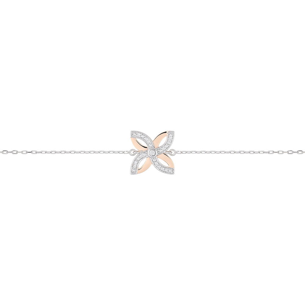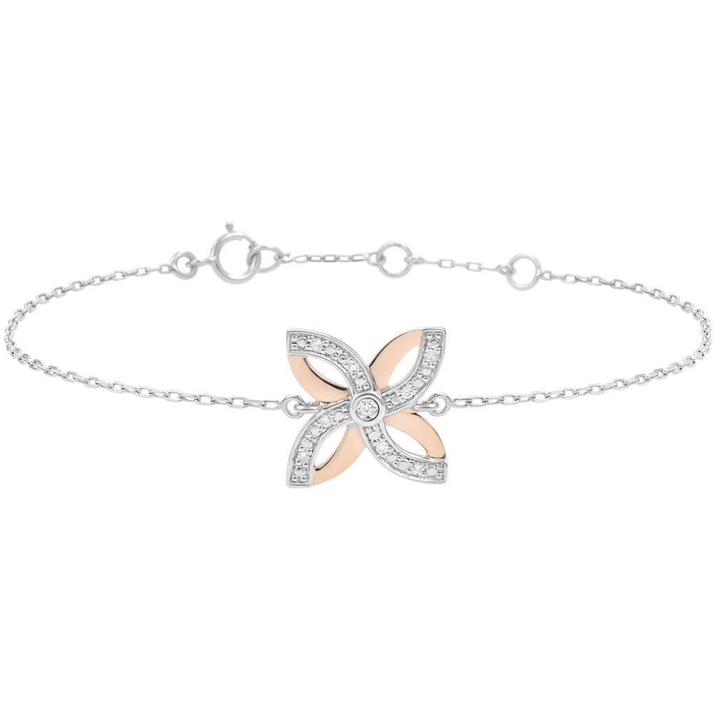 Een gestileerde lelie van witgoud, roségoud en diamanten is gezet op een dunne ketting voor een kostbaar en fijn juweel. Armband met verstelbare lengte: 18cm, 17cm, 16cm. Motief 12mm lang en 12mm hoogte.