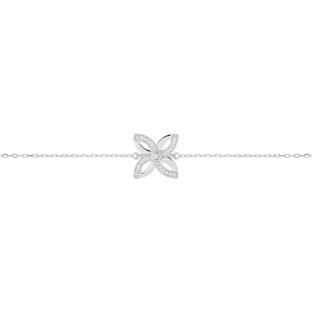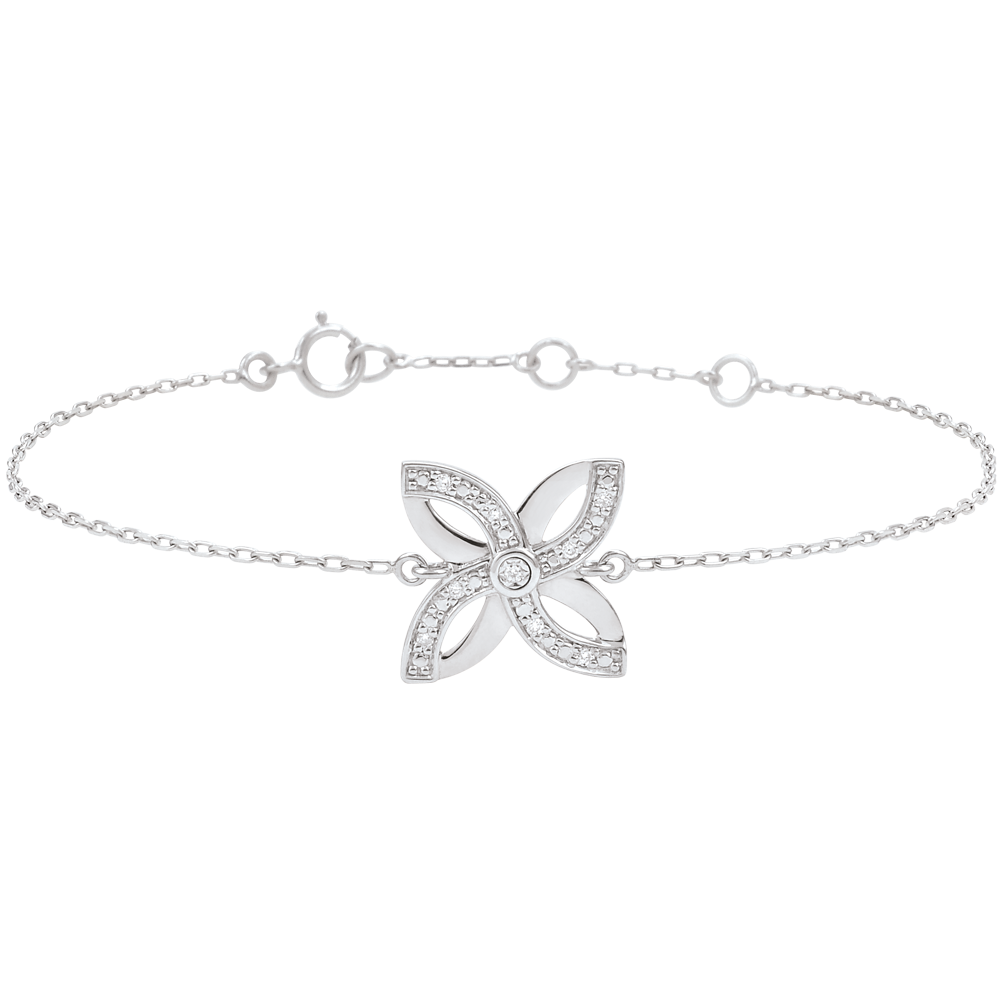 Een gestileerde lelie van witgoud en diamanten is gezet op een dunne ketting voor een kostbaar en fijn juweel. Armband met verstelbare lengte: 18cm, 17cm, 16cm. Motief 12mm lang en 12mm hoogte.