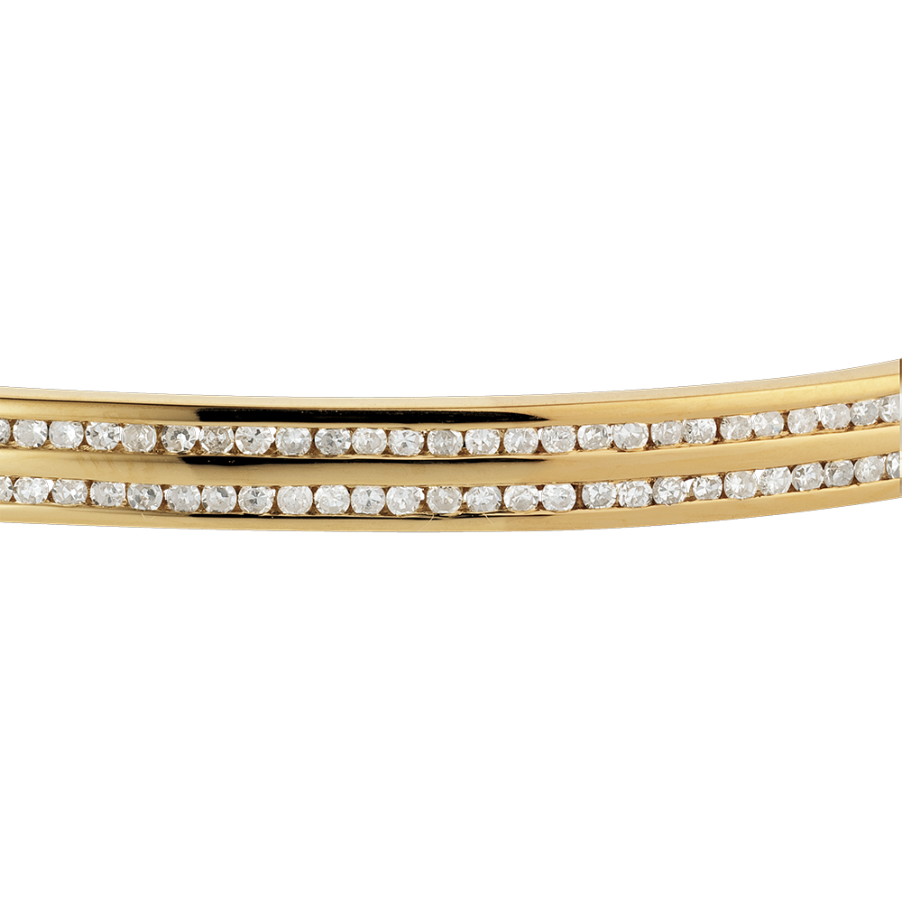 Een geelgouden ring, gekleed in twee rijen van glanzende diamanten