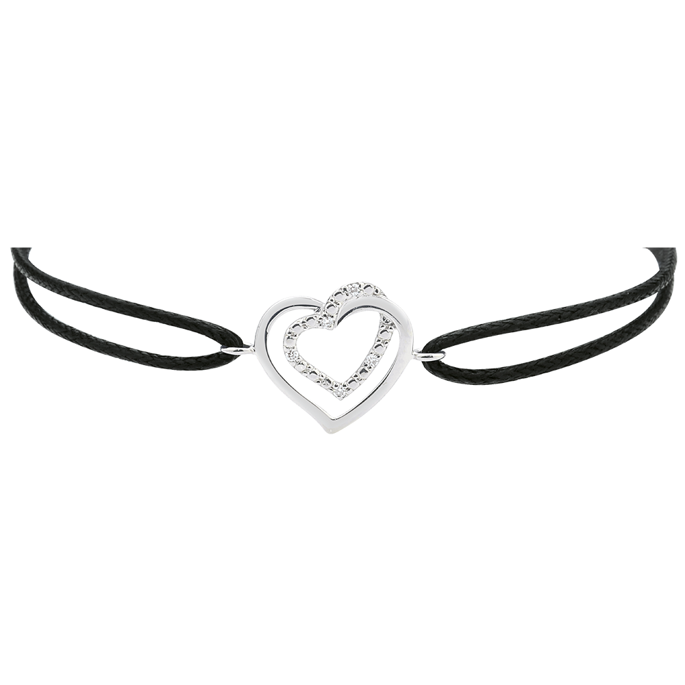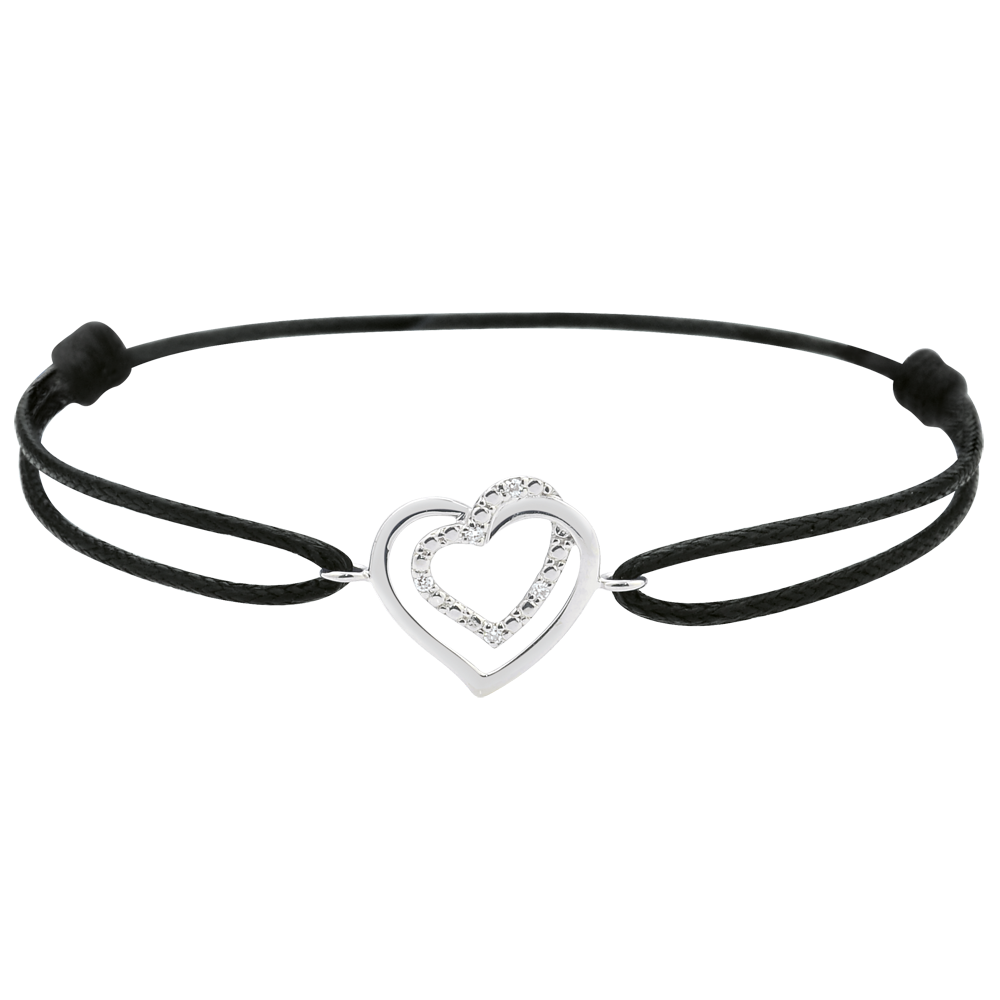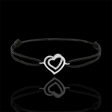 Een duo van harten in tedere en romantische krullen, combineert subtiel witgoud met diamanten. Het motief is gezet op een modern zwart koord. Motief 11,5 mm lang en 11,5 mm in de hoogte.
