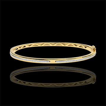 Twee rijen van diamanten worden verenigd als een belofte van de eeuwigheid in een gouden bangle.