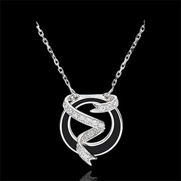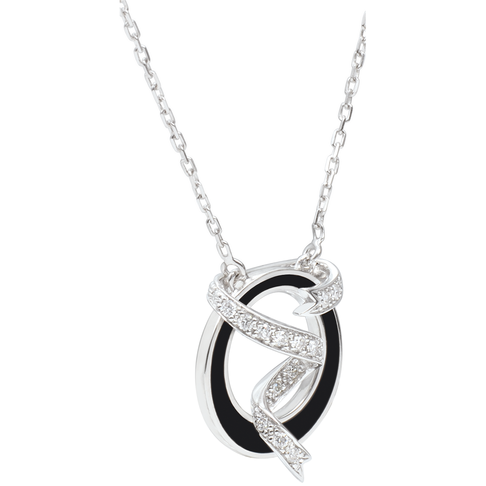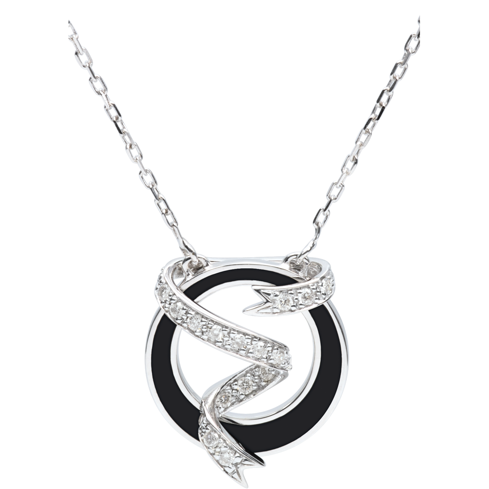 Een gouden cirkel gevuld met zwarte lak wordt doorkruist door een delicaat witgouden lint, rijkelijk geplaveid met diamanten. De pure elegantie.