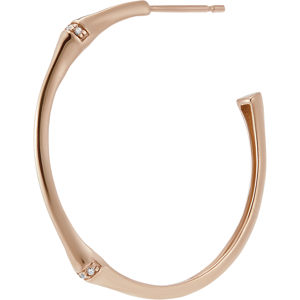 Een flexibele en sterke bamboetak wordt getransformeerd tot een paar eeuwige oorbellen met een diameter van 30 mm. De bamboeknopen zijn ingelegd met diamanten in het goud.