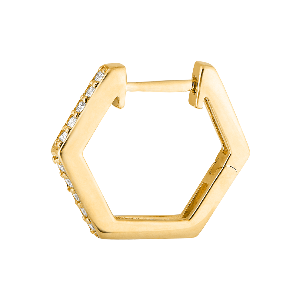 Een paar geelgouden hexagonale oorbellen bezet met delicate diamanten voor een grafisch en modern effect. Een sieraad met een sterke persoonlijkheid.