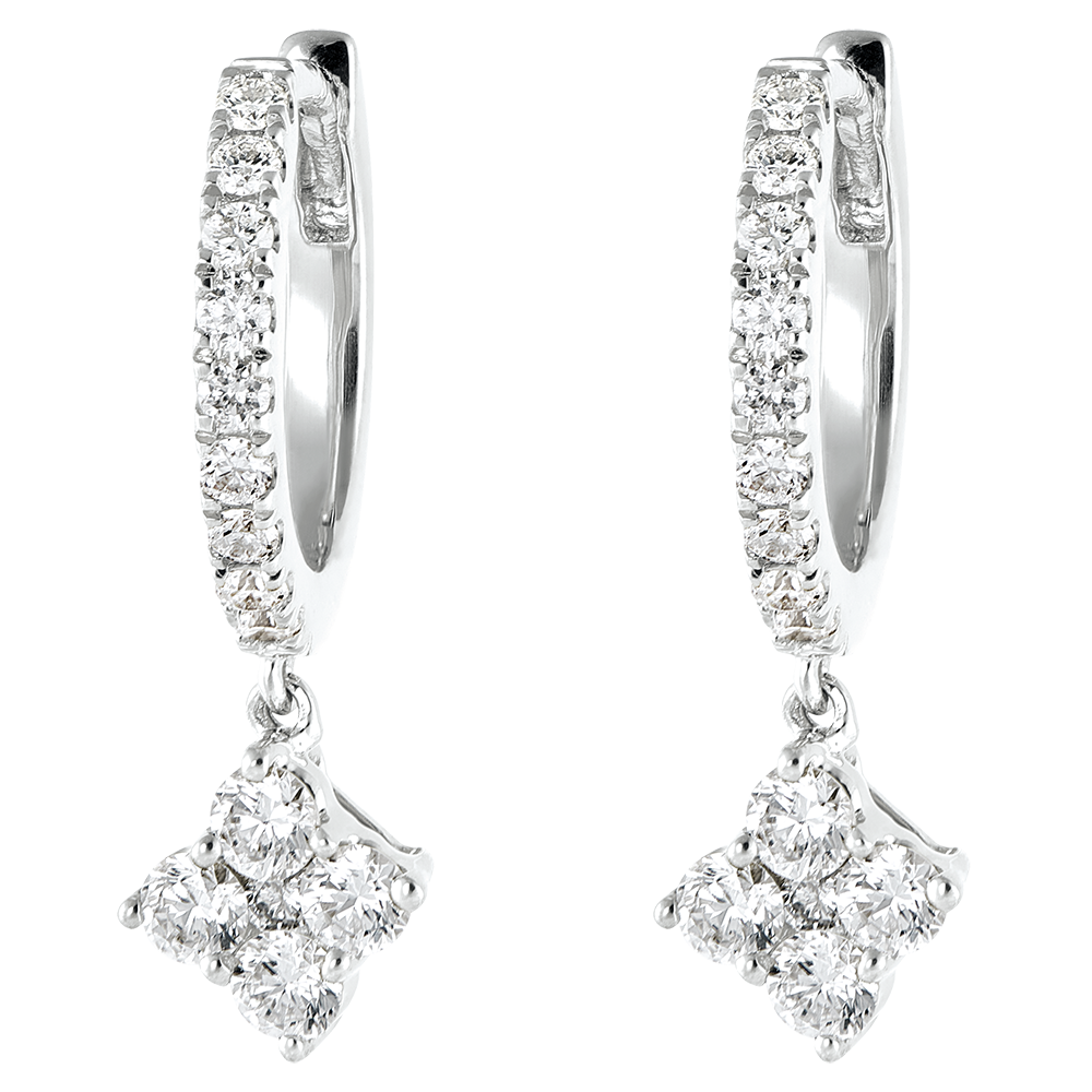 Een paar witgouden semi-pavé diamanten oorbellen waarvan de kwast is bezet met een vierkant van 5 diamanten. Voor een kostbare en moderne tint geeft. Kwastje 5.95 mm breed en 3.20 mm dik.