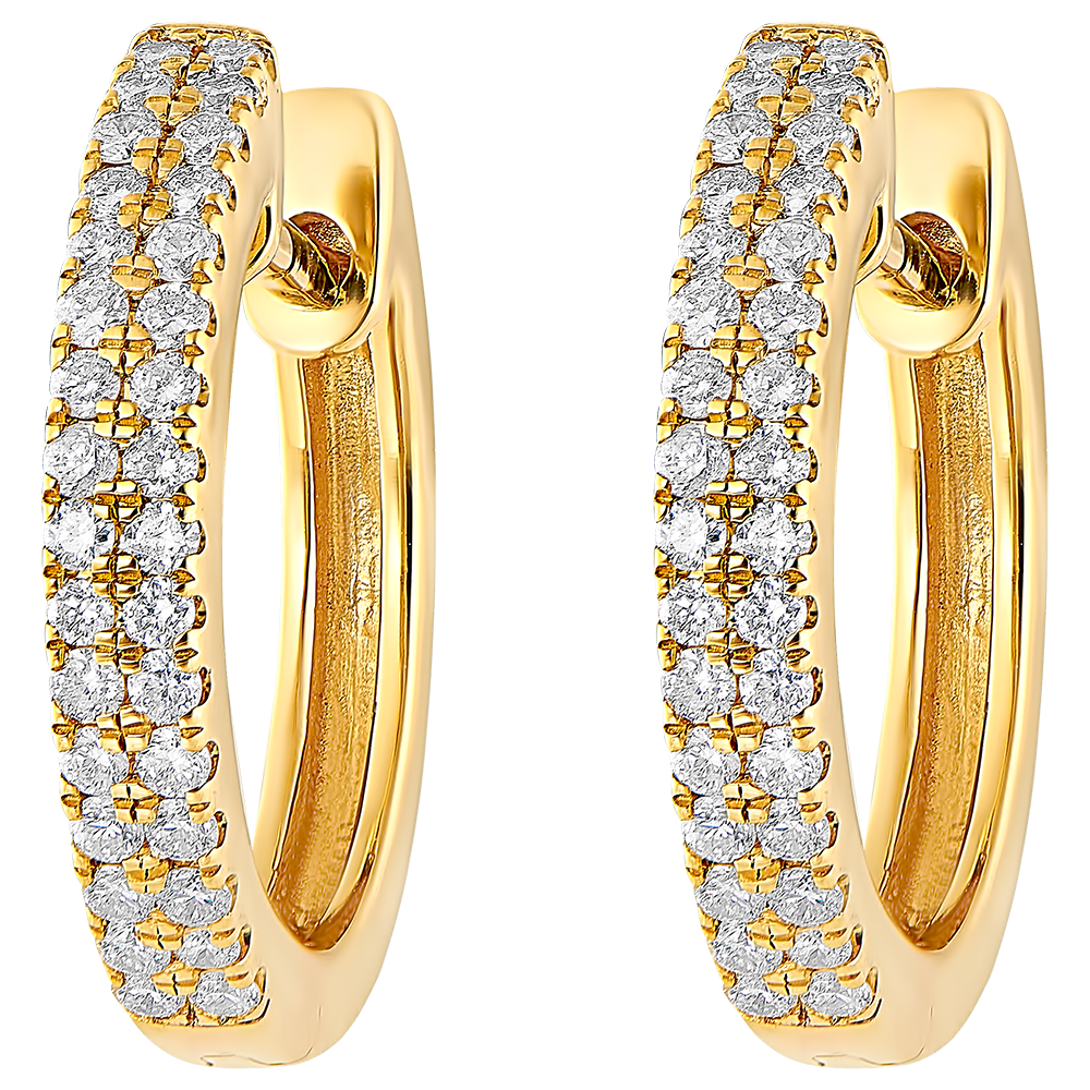 Een paar semi-pavé geelgouden oorbellen met een dubbele rij diamanten voor lichtheid en elegantie.