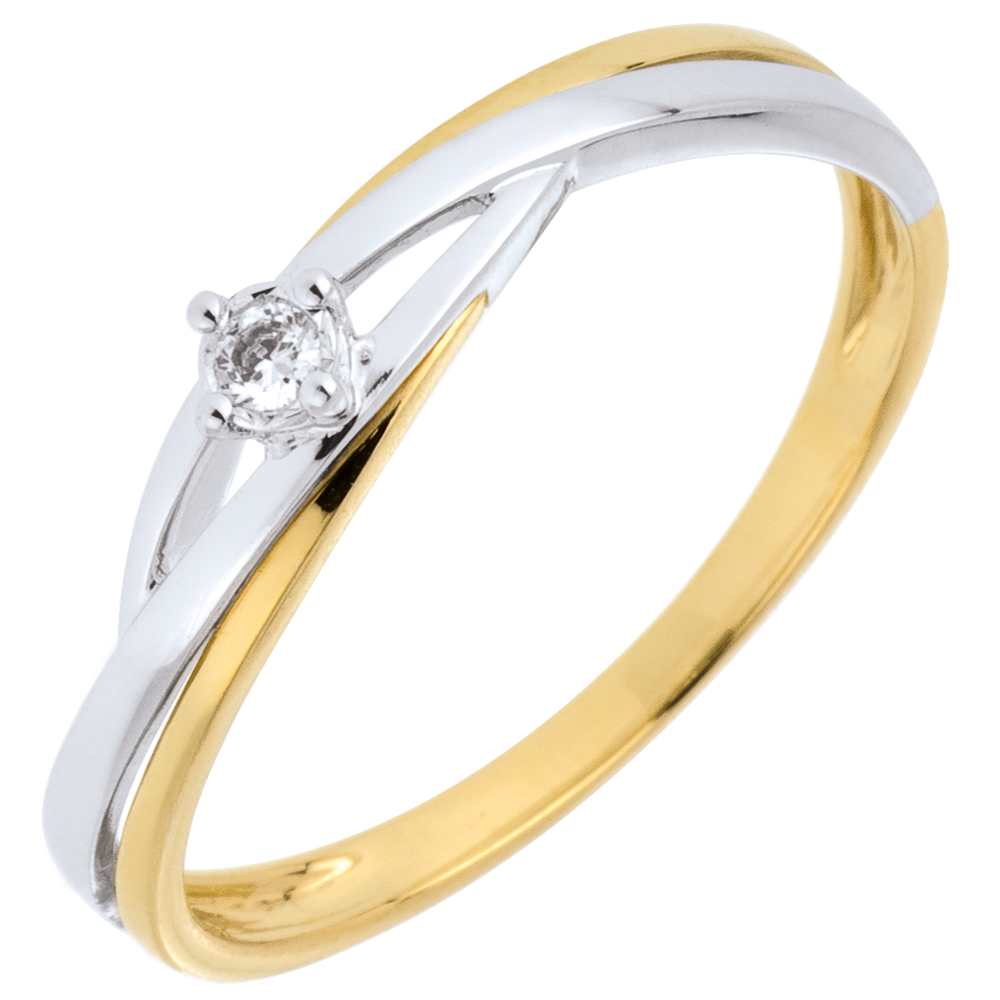 Dit juweel combineert op verfijnde wijze de moderniteit van witgoud met de warmte van geelgoud, voor een duo van goud dat de schittering van de diamant versterkt.