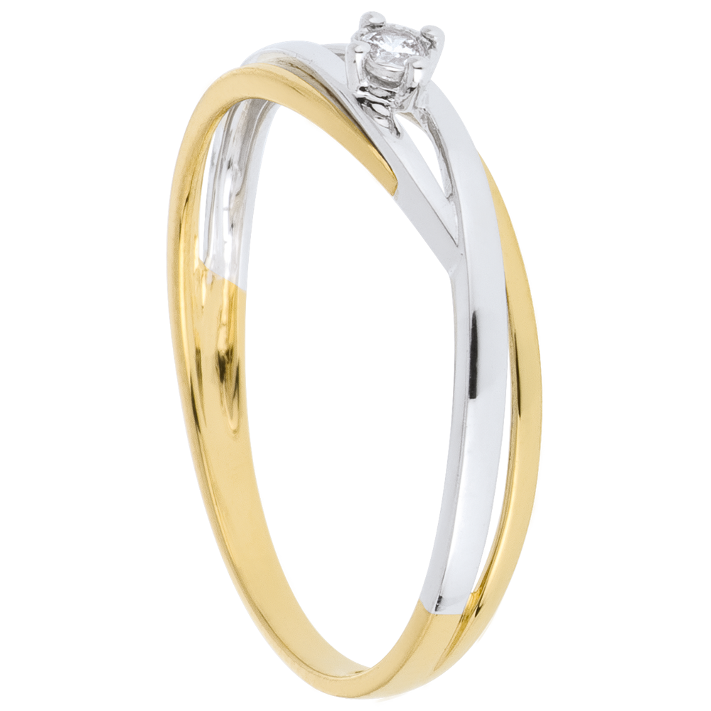- Edelsteen: 1 centrale diamant van 0,03 karaat, geselecteerd vanwege zijn uitzonderlijke schittering.- Materialen: Witgoud en geelgoud (18 karaat = 750/1000), 1,6 g.