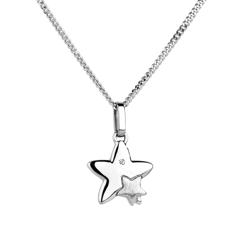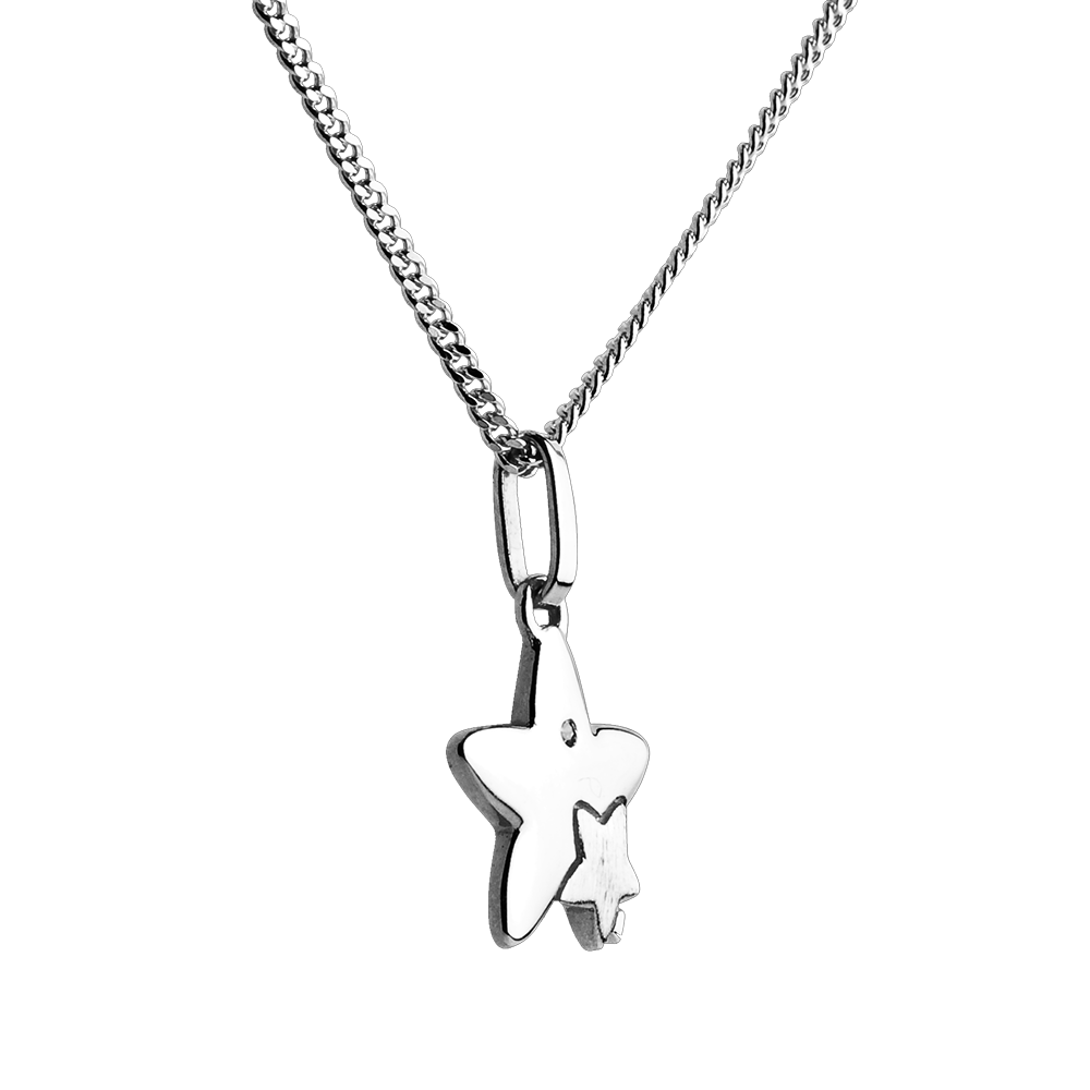 Deze hanger in 18 karaat witgoud toont een duo sterren, een grote die een kleinere draagt, symbool voor tederheid en verbondenheid.