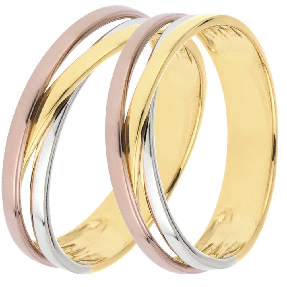 Een trilogie van drie gouden ringen gevlochten voor een prachtige trouwring.