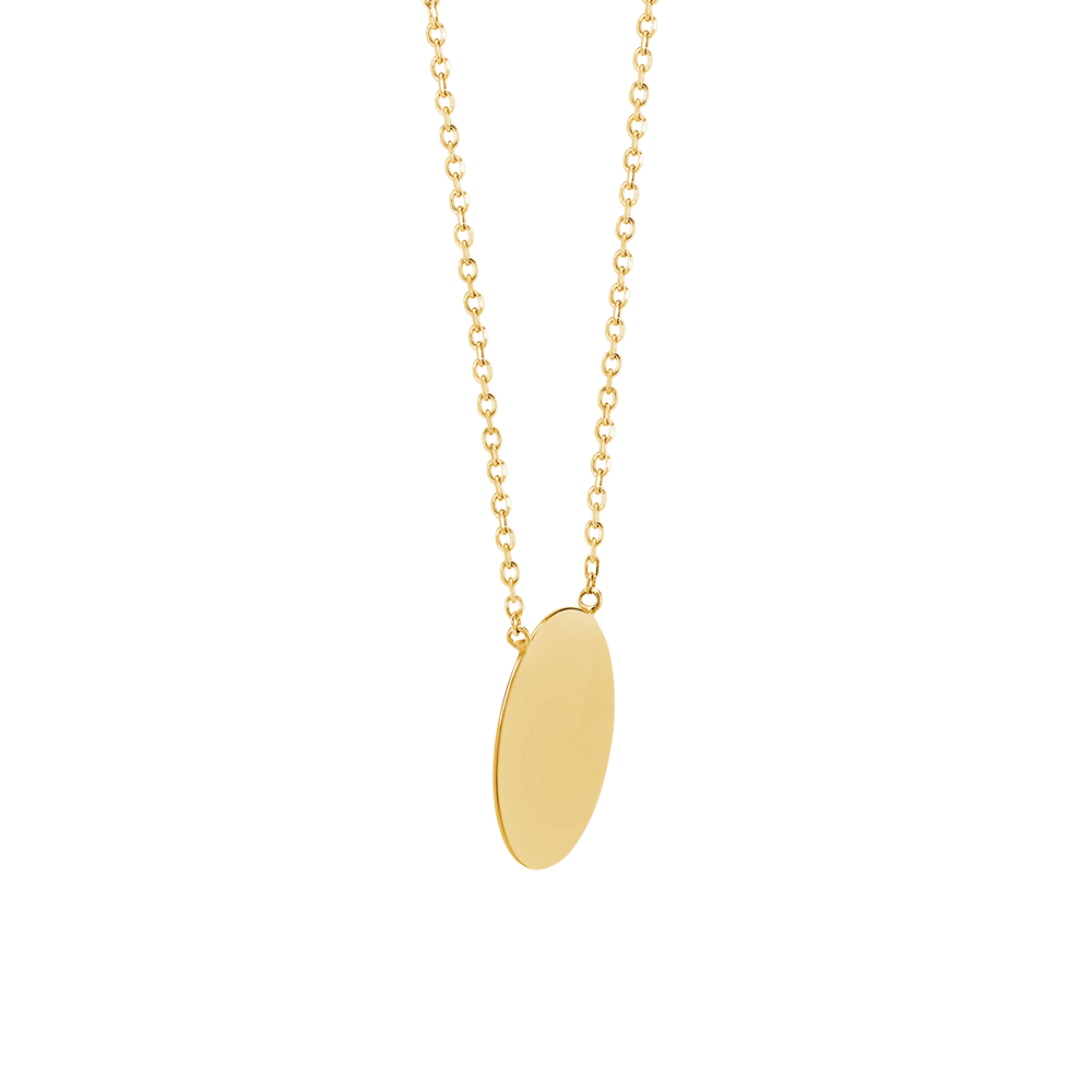 Deze ketting, volledig vervaardigd uit 9-karaats geelgoud, heeft een ronde medaille die naar wens gegraveerd kan worden. Het is een verfijnd en betekenisvol sieraad om dierbare herinneringen dicht bij te dragen.