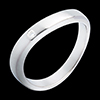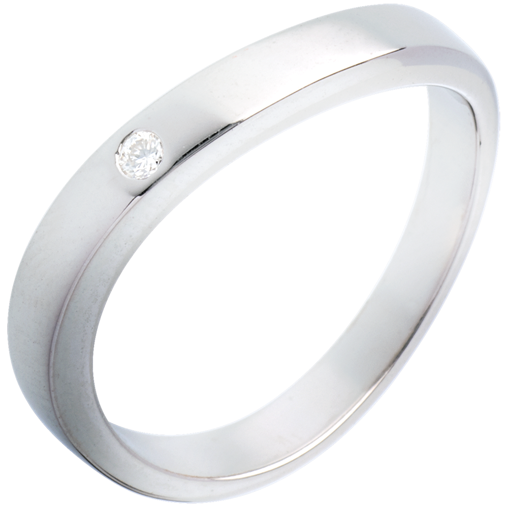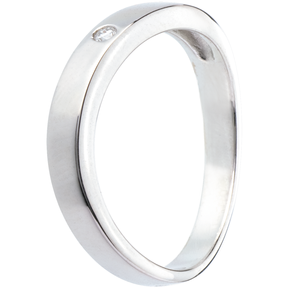 Een gebogen witgouden ring met een vierkante doorsnede en een diamant.