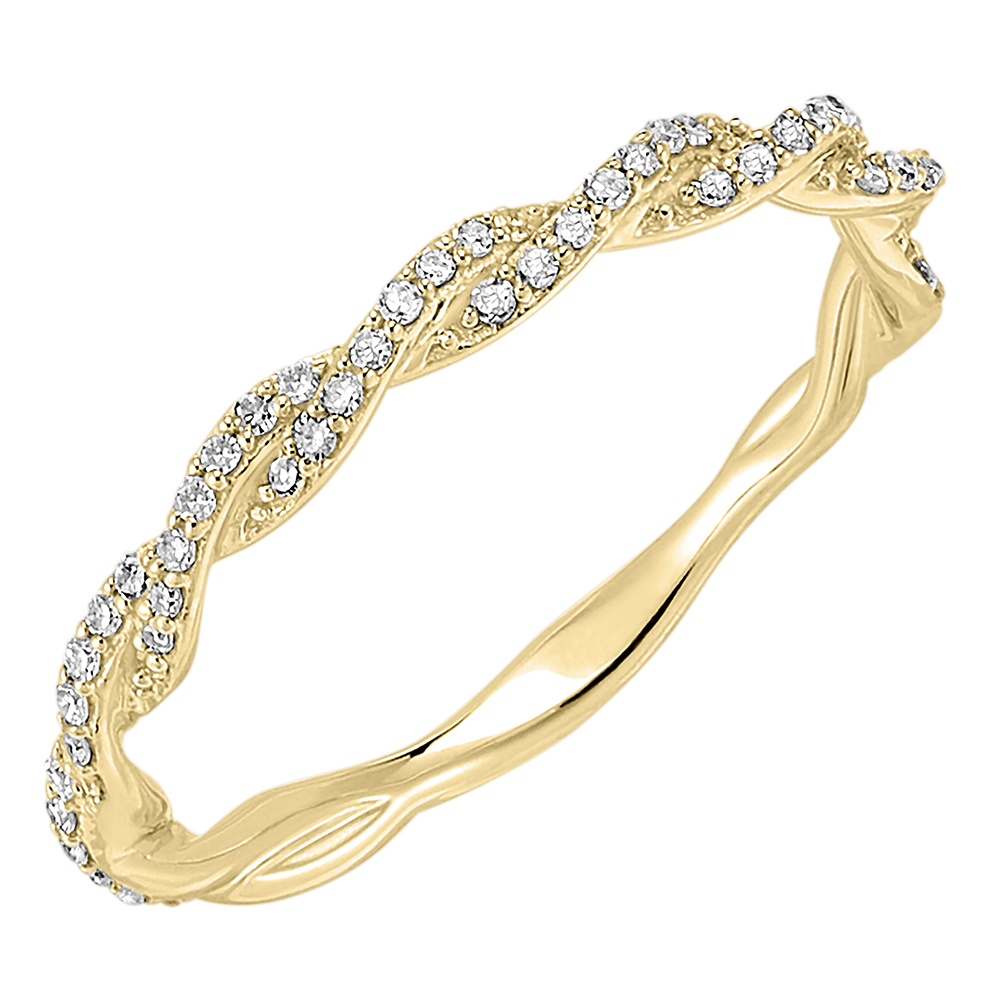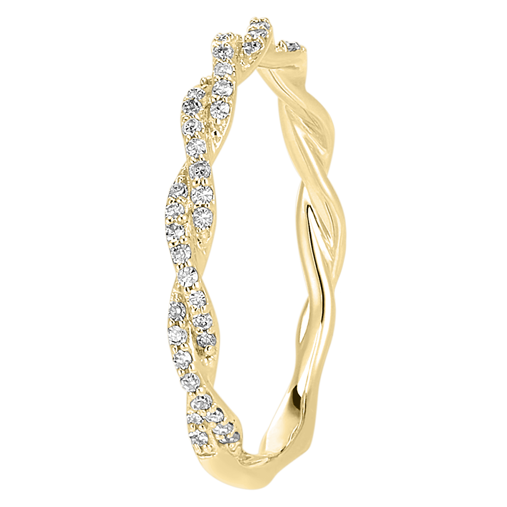 Een ring waar twee geelgouden draden bezet met diamanten in elkaar verstrengeld zijn als een eeuwige omhelzing.