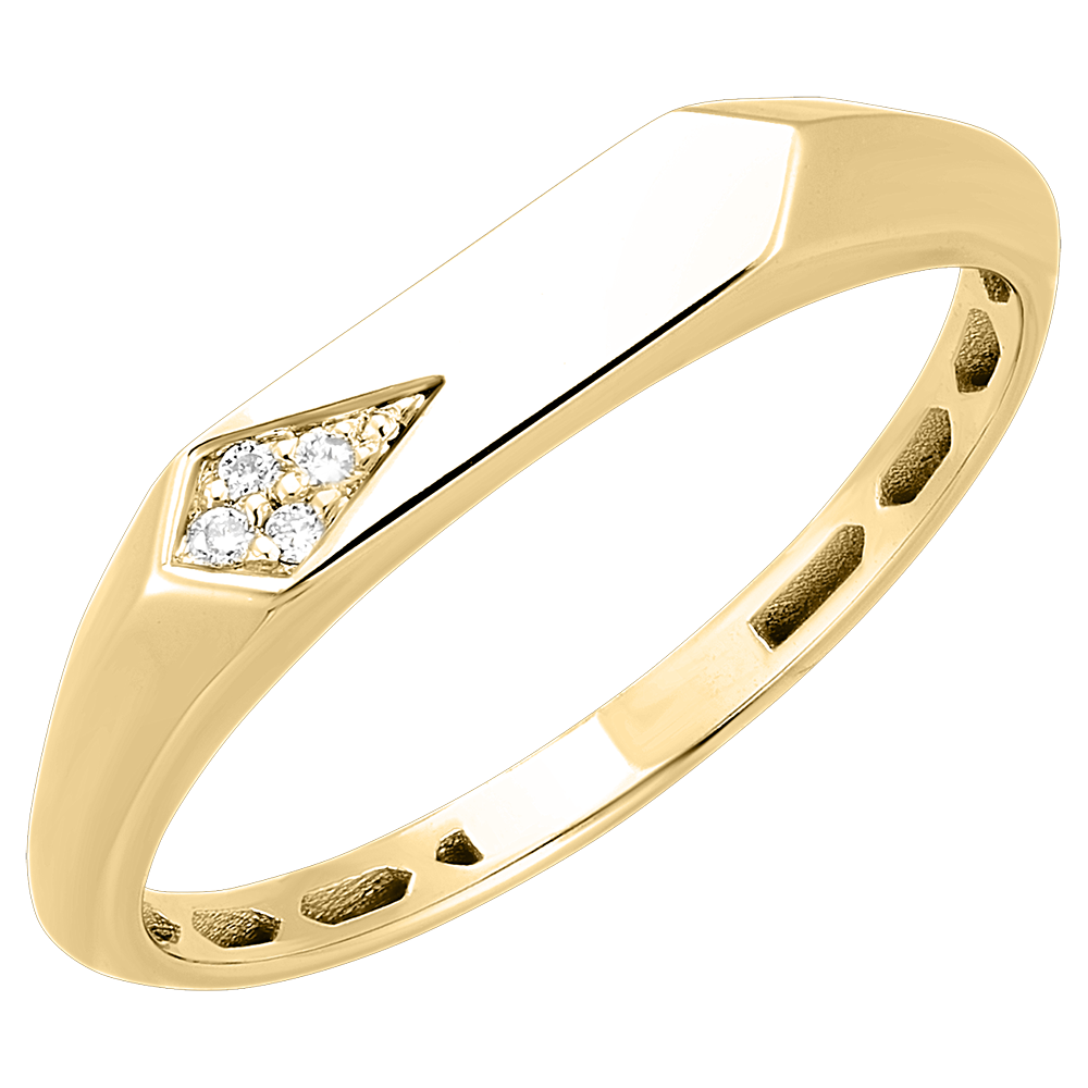 Een elegante geelgouden ring, gekenmerkt door strakke lijnen en een geometrisch patroon bezet met sprankelende diamanten die vanuit elke hoek het licht opvangen. Een stuk dat zowel klassiek als ultramodern is.