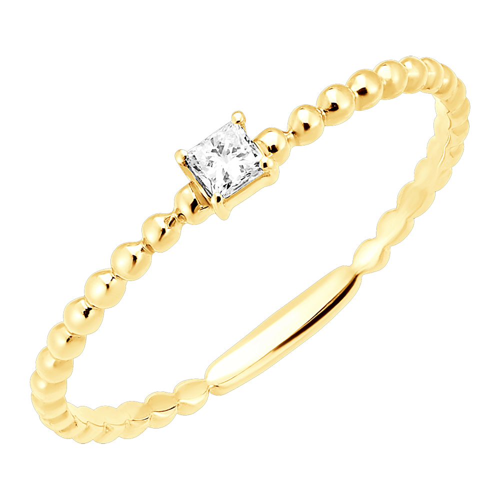 De Bubble Princess Solitaire heeft een geelgouden ring met ruches bezet met delicate prinsesgeslepen diamanten voor een moderne elegantie.