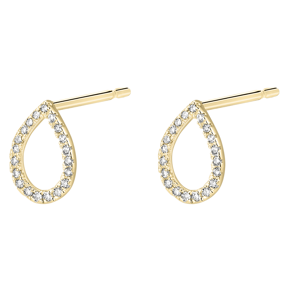 Twee druppels, delicaat bezet met diamanten in geel goud, voor een zuiver model, dicht bij de elementen en emoties.