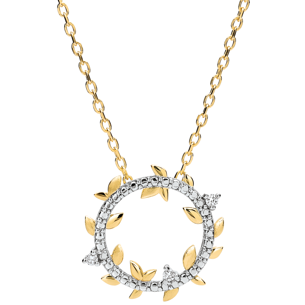 Afwisselend blad geelgoud en schitterende geborstelde bladeren voor een romantische ketting bezet met 6 diamanten.