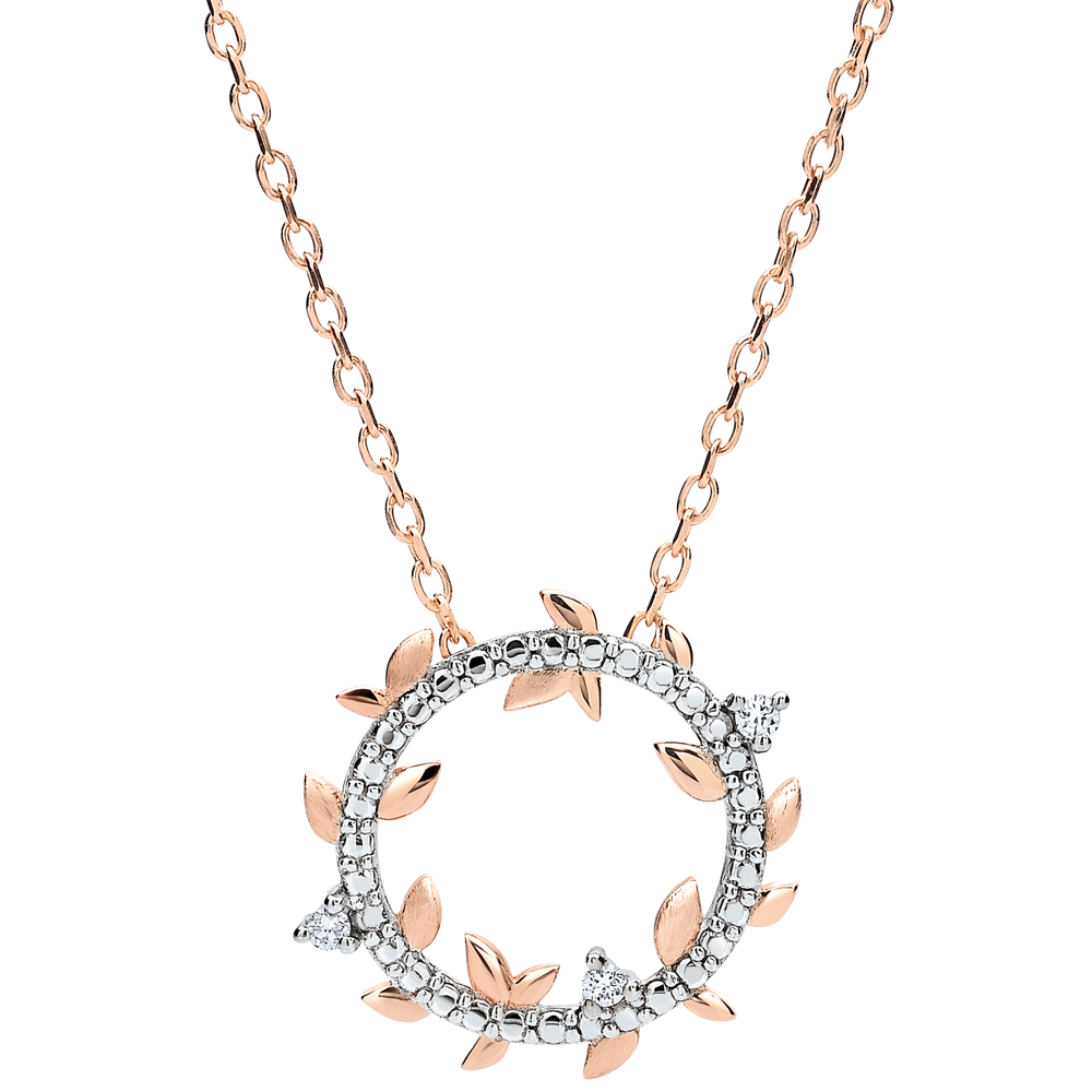 Afwisselend blad roségoud en schitterende geborstelde bladeren voor een romantische ketting bezet met 3 diamanten.