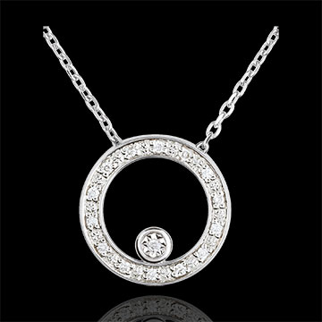 Een cirkel van goud bezet met diamanten dragen een diamant in een witgouden cirkel opgehangen aan een witgouden ketting. Tijdloos en elegant voor alle gelegenheden.