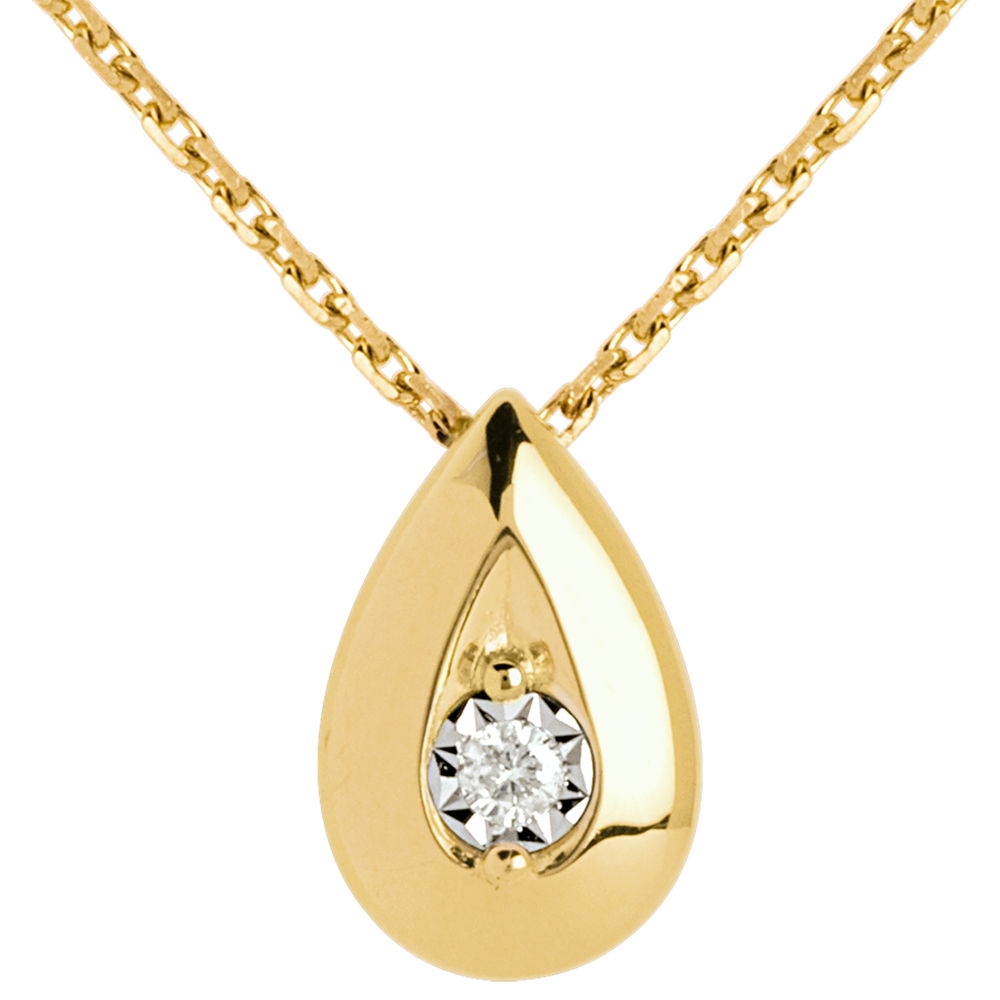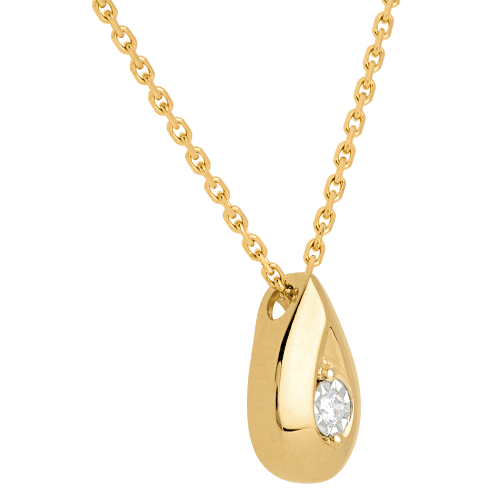 Deze halsketting van 9 karaat geelgoud heeft een druppelvormige hanger met een centrale diamant van 0,026 karaat.