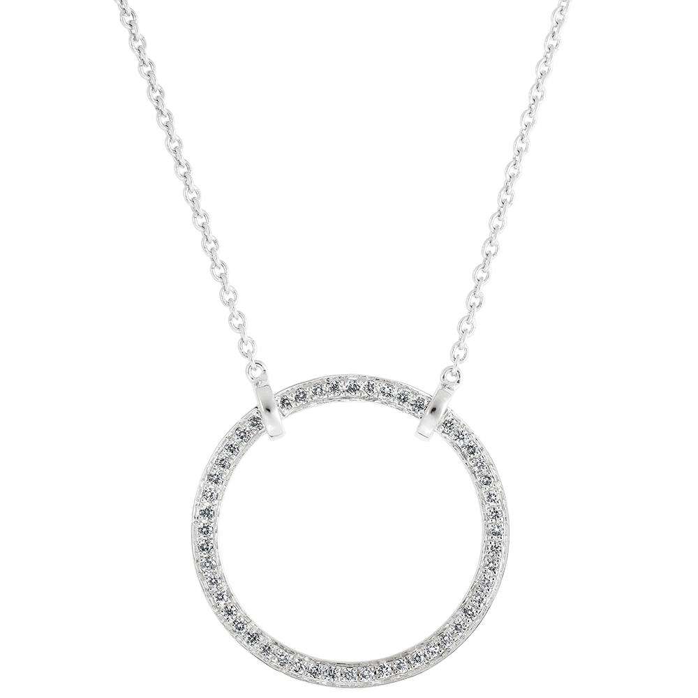 Een delicate cirkel van witgoud vervraaid met pavé diamanten. Een opnieuw bezocht klassieker.Met een 45 cm lange ketting en een verstelring op 42 cm.
