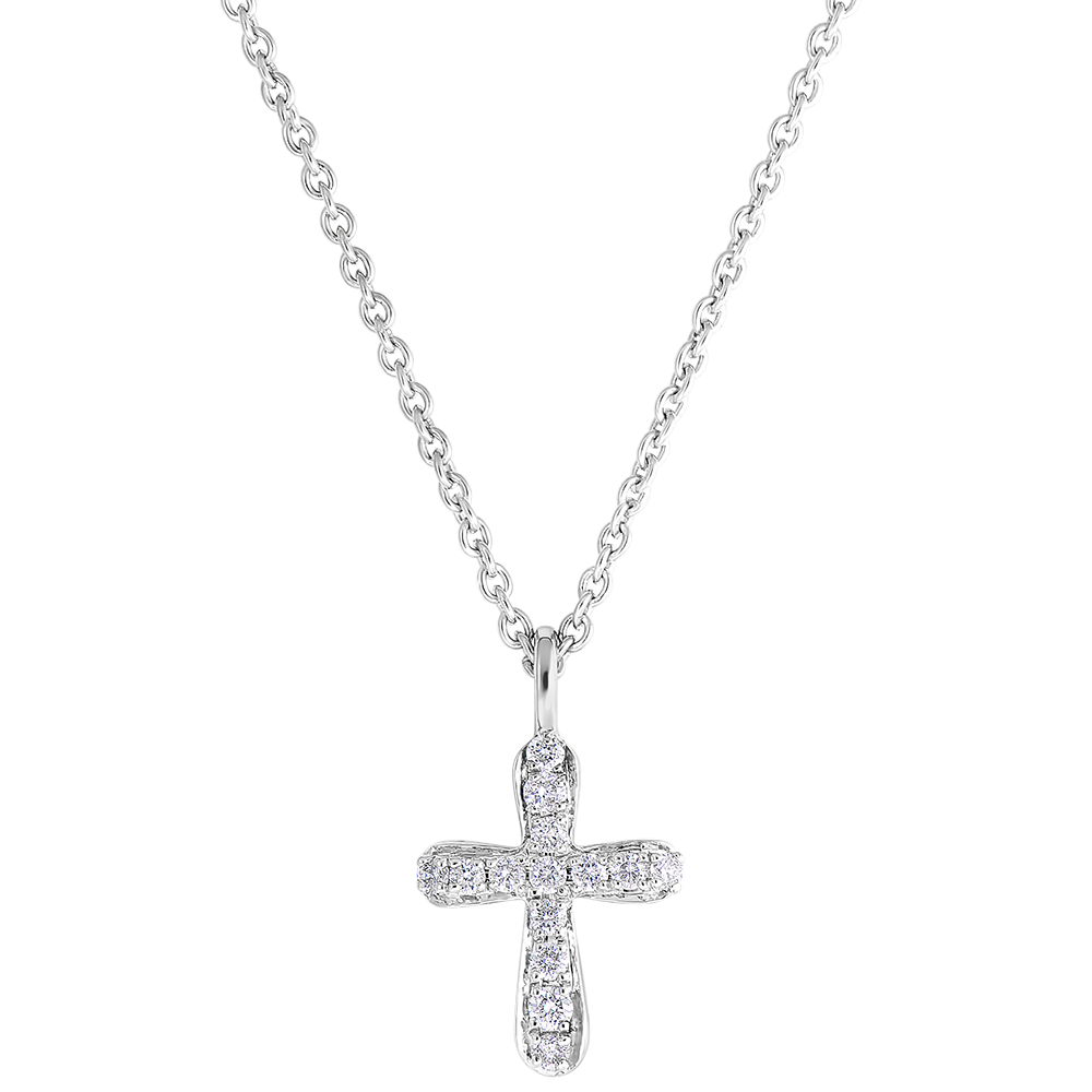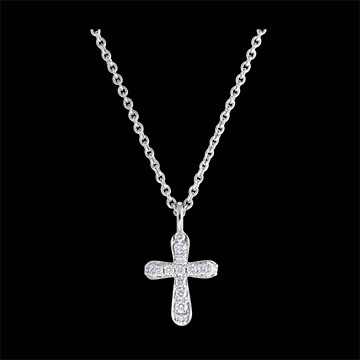 Een witgouden halsketting met een kruis bezet met diamanten. Een vrome icoon opnieuw bezocht in een eigentijdse stijl, met een "rock" tintje. Met een 45 cm lange ketting en een verstelring op 42 cm.