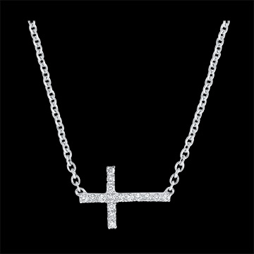Een essentiële witgouden kruis halsketting, met fijne en delicate verhoudingen. Vervraaid met nauwgezette pavé diamanten bezet op een ketting. Met een 45 cm lange ketting en een verstelring op 42 cm.