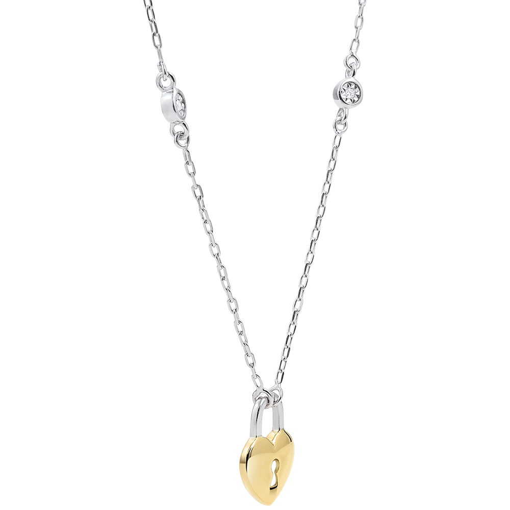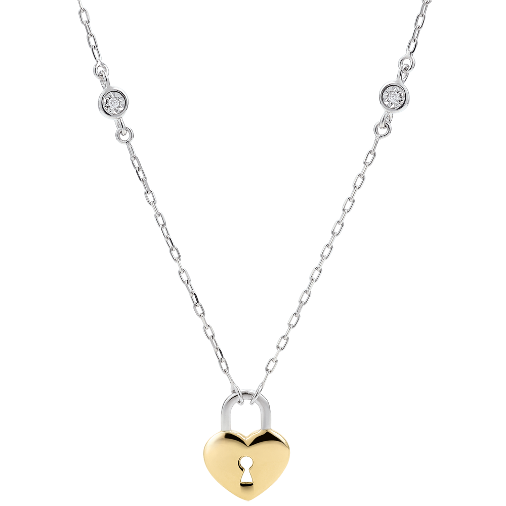 Een geelgouden halsketting met hartslotje is gezet op een witgouden ketting bedekt met twee briljanten.