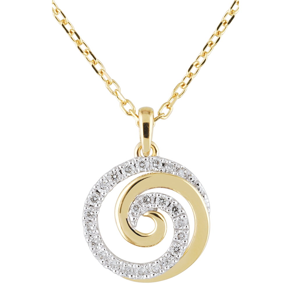 Waardevolle spiraal van geelgoud en diamanten is opgehangen aan een geelgouden ketting.