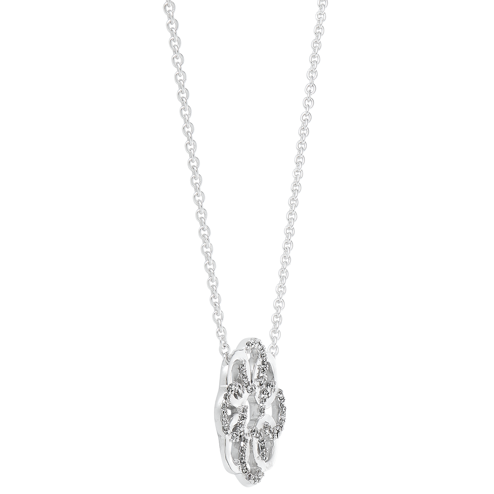 Caleidoscopische pavé en ingewikkelde rondingen voor een creatieve en verfijnde witgouden halsketting. Met een 45 cm lange ketting en een verstelring op 42 cm.