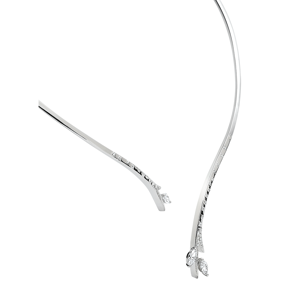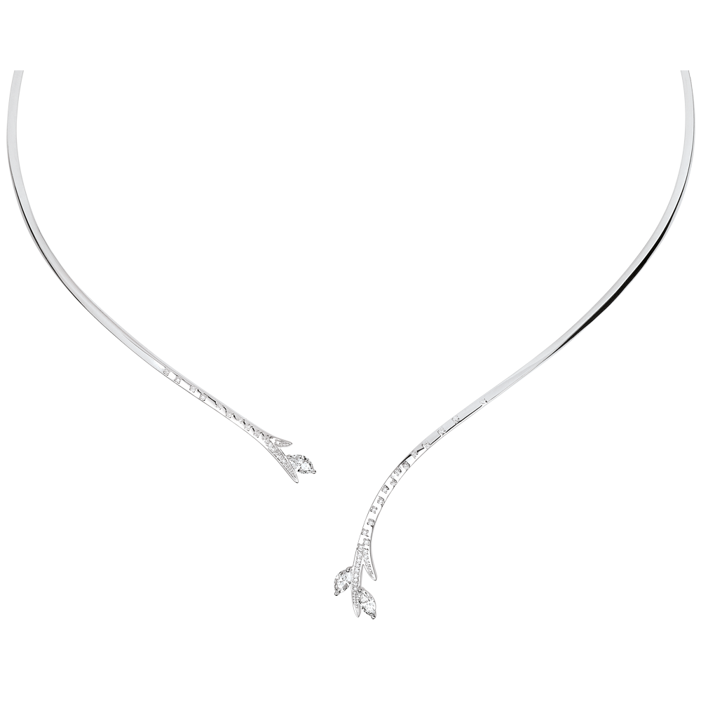 Een schitterende tak, tijdloos bevroren, is deze eeuwenoud of nieuw geboren? Zijn kostbare blad, zijn zaadje in diamant, worden versterkt door het witgoud, bezet met de diamanten die hen omkaderen.