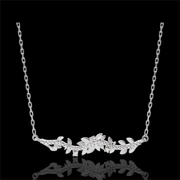Afwisselend blad witgoud en schitterende met de hand geborstelde bladeren, voor een romantische ketting met zeven diamanten.